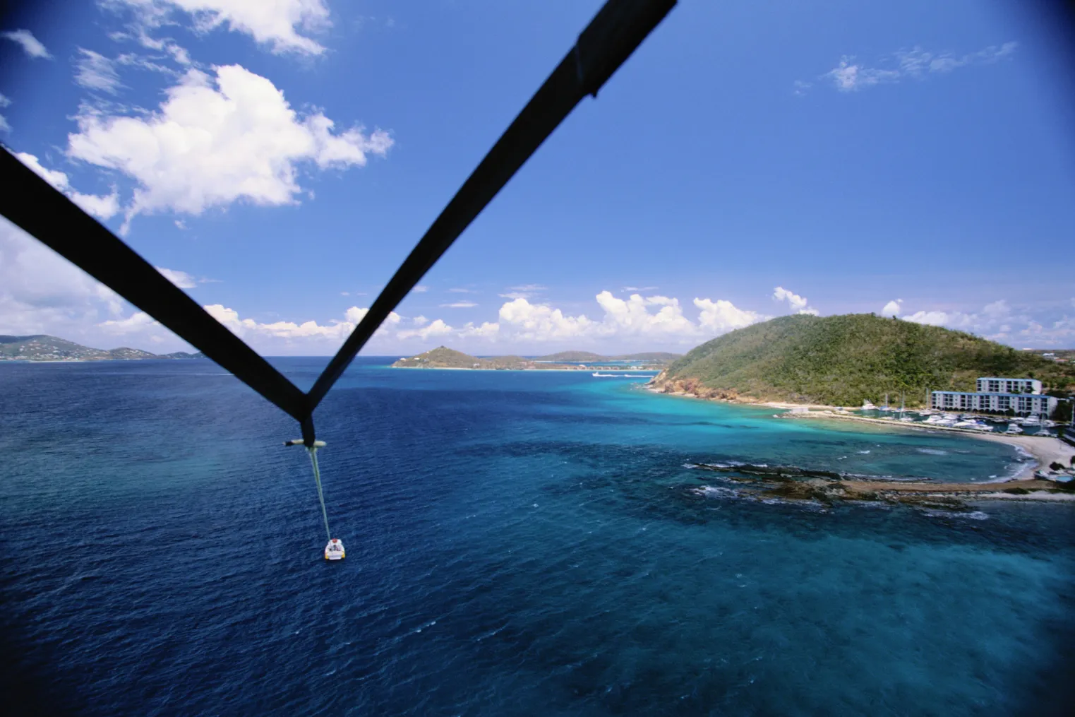 Start wide as the boat steadies, usually in the first five minutes aloft, before the line swings you off angle. Use a wide composition, keep the horizon level, and leave the hotels small.